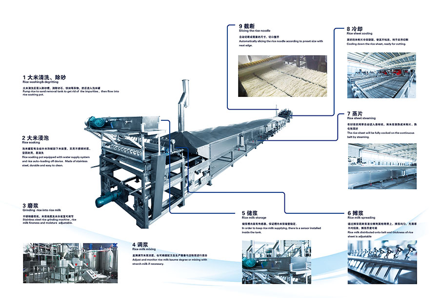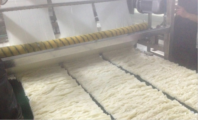布好漿的網(wǎng)帶自動(dòng)進(jìn)入蒸粉機,將米漿蒸熟成米粉片,熟化效果好;