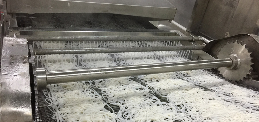 快速的煮粉后米粉由網(wǎng)帶輸送至連續蒸粉機,蒸后的米粉達到完全熟化。